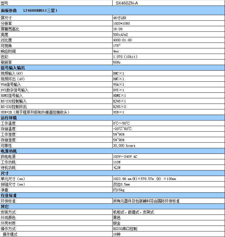 46寸液晶拼接屏規格參數:46寸3.5mm