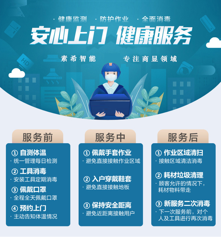 服務前:首先素希員工將測量體溫,也是由素希綜合管理部門負責每日檢測,其次是大家都知道安裝液晶拼接屏會有工具等,工具消毒成為每天必不可少的一部分所以我們在安裝前會進行工具消毒,安裝完工以后工具進行二次消毒,再則每天由綜合管理部每天按時給素希每位員工發放口罩,要求全廠人員全程全天佩戴口罩,最后我們會提前給客戶電話預約關于安裝液晶拼接屏時間,并且主動告知客戶們安裝工人的體溫情況。